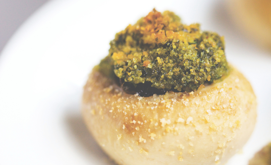 Lavez les champignons de Paris et coupez leur pied. Faites étuver les chapeaux dans une sauteuse à couvert avec la noix de beurre et 10 cl d'eau jusqu'à l'évaporation presque complète du liquide, puis égouttez-les et réservez-les au frais. Epluchez l'ail, retirez-en le germe et ciselez- très finement.