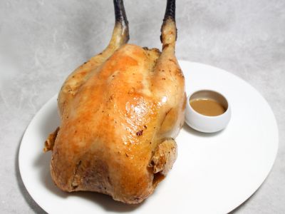 Retirer les ficelles du chapon s’il a déjà été bridé. Le saler légèrement à l’intérieur. Avec une c. à s., déposer toute la farce dans le ventre du chapon en la poussant bien jusqu’au fond. Le brider et le saler.