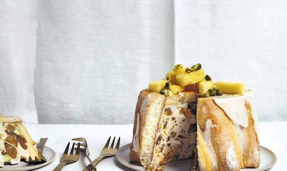 Une charlotte à l'ananas, fromage blanc, pistaches : un dessert frais et gourmand.