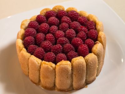 Démouler la charlotte sur un plat et la décorer de framboises.
