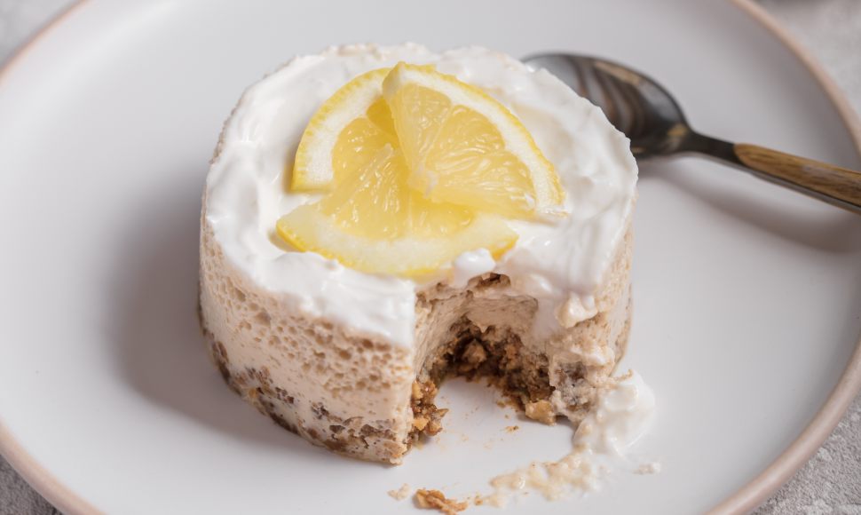 Dans l'esprit d'un cheesecake, une base datte-amande, une crème au citron et une chantilly à la noix de coco.