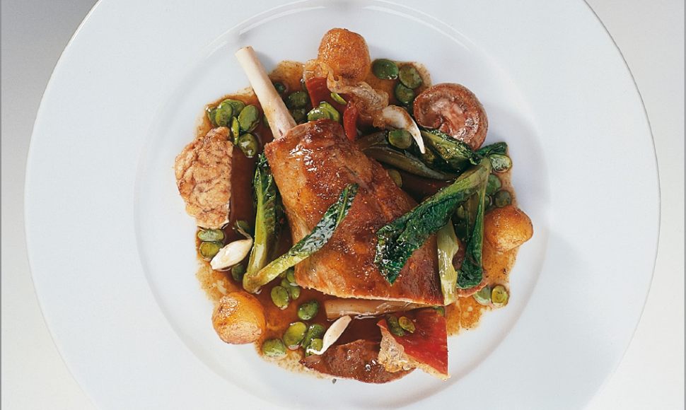 Chevreau de lait de l’arrière-pays niçois frotté de piment d’espelette et de romarin, cuit à la cheminée, févettes et côtes de sucrine cuisinées aux bouts de jambon, sauté d’abats, vrai jus