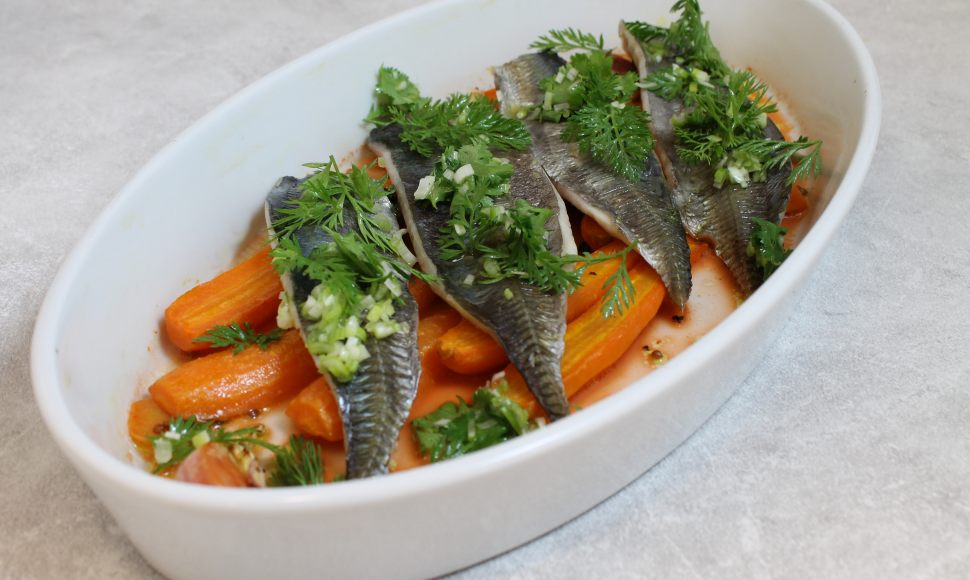 Le chinchard est un poisson souvent confondu avec le maquereau par sa peau argenté et sa taille allant de 14 à 45 cm. Dans cette recette il marine avec de l'ail, du piment d'Espelette et du thym pour s'imprégner de leurs saveurs. Dans ce plat, il est accompagné de carottes fanes fondantes, mais vous pouvez ajouter d'autres légumes au gré de vos envies.