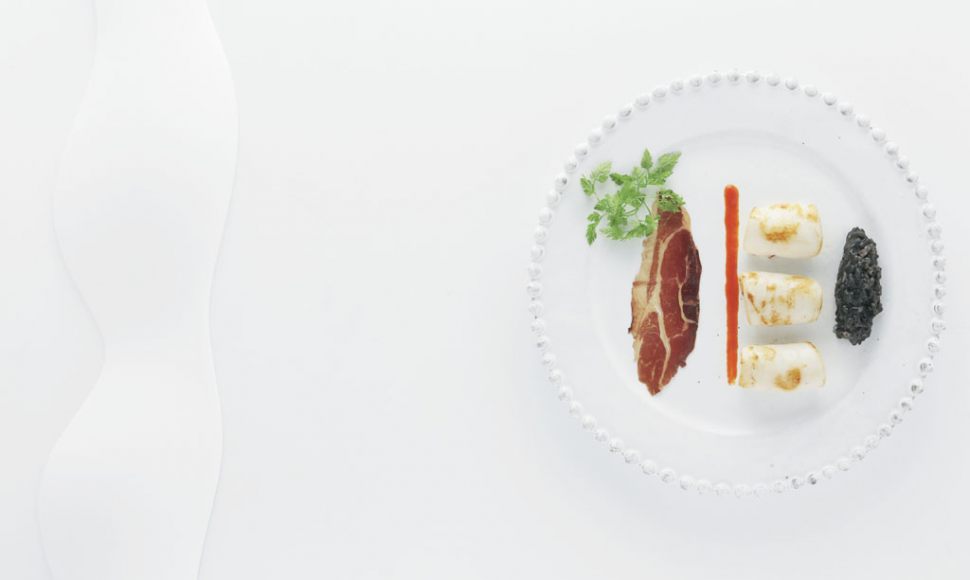 Chipiron à la plancha, riz moelleux à l’encre, jus de piquillos