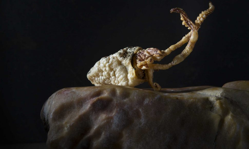 De délicieux calamars frits que le chef Mauro Colagreco sert recouverts d'une purée de calmar et de poudre d'algue nori.