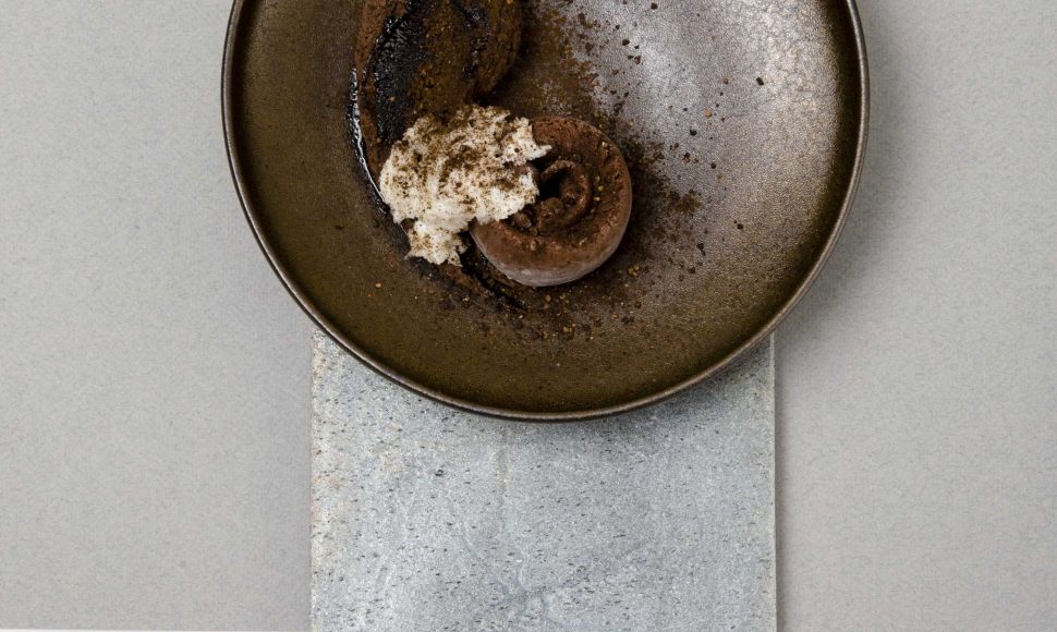 Une mousse crème brulée chocolat avec une pâte d'orge toastée, accompagnée d'un sorbet chocolat-whisky et d'un granité du même alcool.