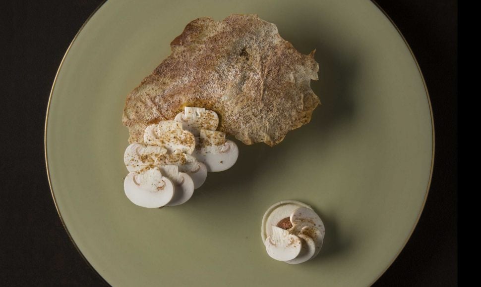 Un dessert au mariage de saveurs peu commun, une purée de champignons associée à un crémeux et des plaques au chocolat noir du Pérou !