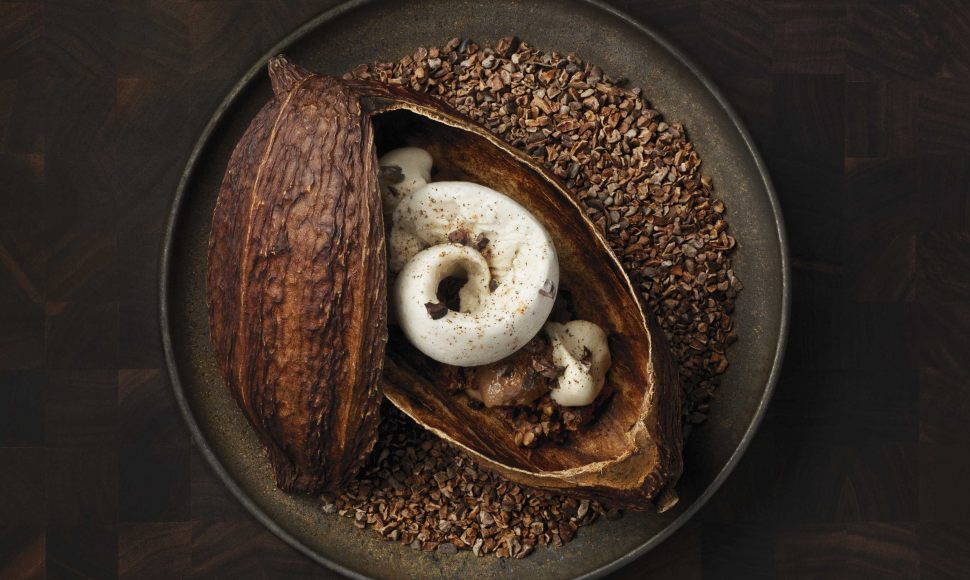 Servi dans une cabosse séchée, ce dessert joue sur les torréfactions : chocolat, café et sarrasin mêlent leurs parfums grillés pour une version mature des douceurs de l'enfance.