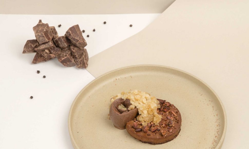Un crémeux au chocolat saupoudré de fèves de cacao, accompagné d'un sorbet chocolat-poivre et d'un granité cardamome.
