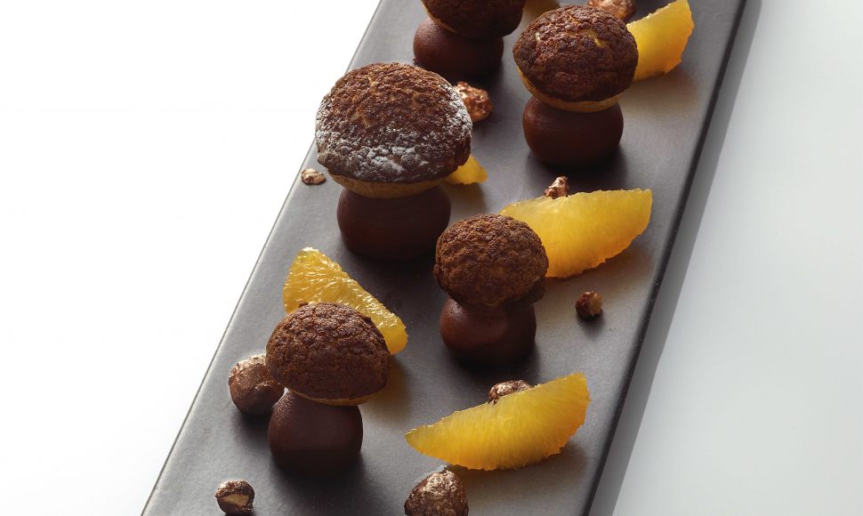Je voulais prouver que le chou se prêtait bien au dessert à l’assiette. Ce dressage ressemble à une promenade dans les bois, avec les saveurs que j’adore : l’agrume et le gianduja.