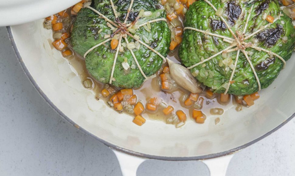 Faites bouillir une casserole d’eau salée et préparez un saladier avec de l’eau et des glaçons. Détachez les premières feuilles du chou (8 à 10). Plongez-les dans l’eau bouillante 2 min. Retirez-les et refroidissez-les dans l’eau glacée. Égouttez-les et retirez le bas de la grosse côte au centre. Émincez le cœur du chou, faites le blanchir et refroidir de la même façon, puis égouttez-le. Faites fondre le beurre dans un sautoir et faites suer ce chou pendant 5 min, salez légèrement et réservez.
