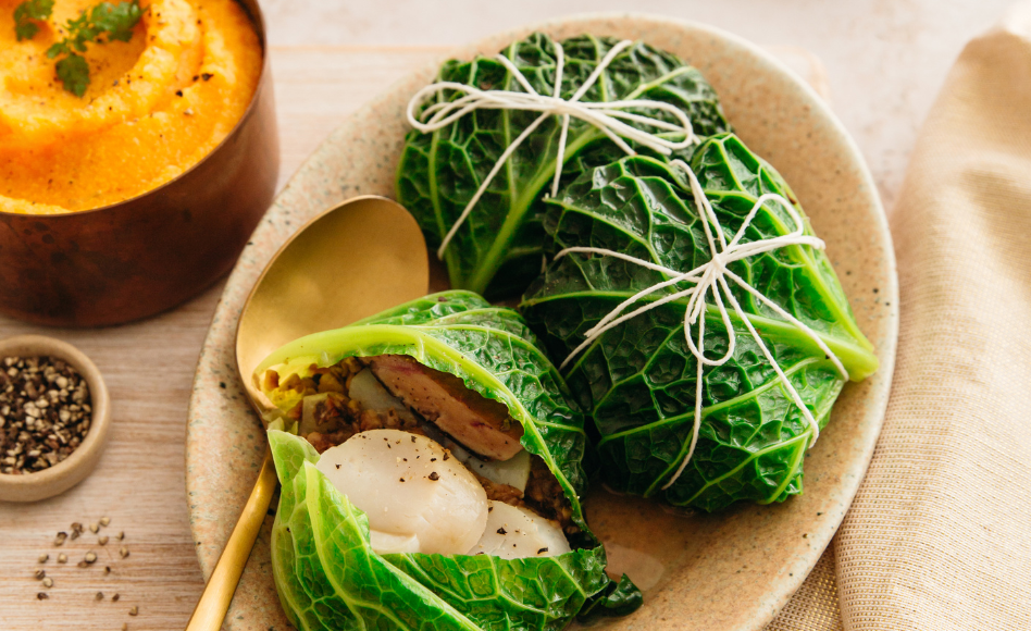 Un mariage de saveurs raffiné avec ce chou farci délicatement garni de foie gras fondant et de noix de Saint-Jacques. Un plat festif et sophistiqué qui sublime la terre et la mer.