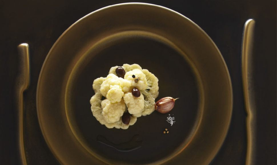 "Cali’a frori soffocáu est une recette assez commune en Sardaigne (soffocáu signifie "à l’étouffée" en sarde). Nous avons beaucoup raccourci la cuisson, préféré les olives noires aux vertes et l’ail confit à l’ail frais."