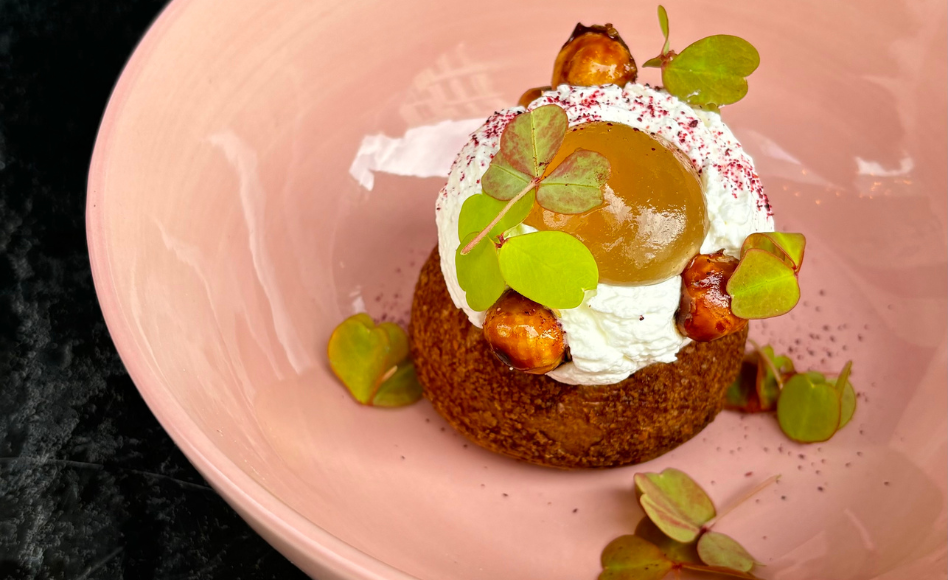 Un dessert à retrouver à la carte de Sadarnac, le restaurant de la cheffe Lise Deveix, et qui associe les notes boisées de la noisettes à celles, florales, du sureau.