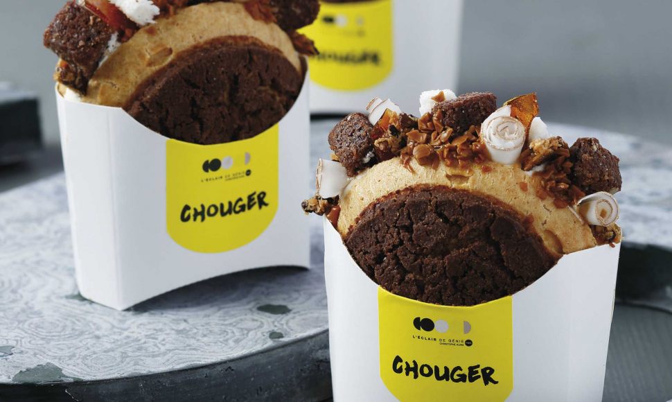 Un dérivé sucré du hamburger : une grosse pâte à choux, remplie de guimauves et mousse coco, de brownie macadamia, ainsi que d'un crémeux caramel.
