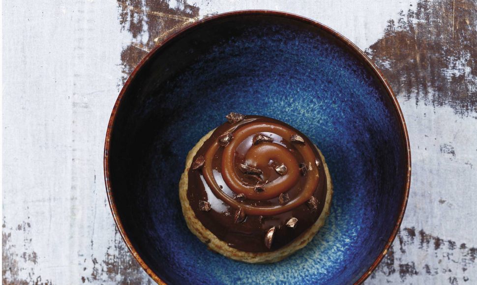 Un choux à la crème café-vanille, recouvert d'un glaçage caramel-café et d'un crémeux caramel.