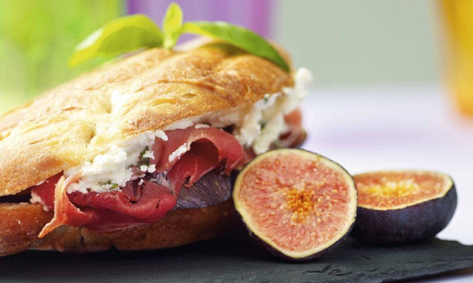 Un petit sandwich sucré-salé et bien frais au ciabattas, fromage de chèvre, jambon cru et figues.