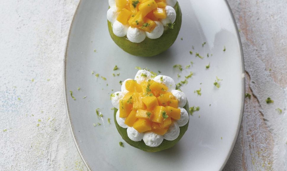 Des citrons verts givrés garnis d'une mousse citron vert et d'une brunoise de mangue, pour un dessert tout en légèreté.