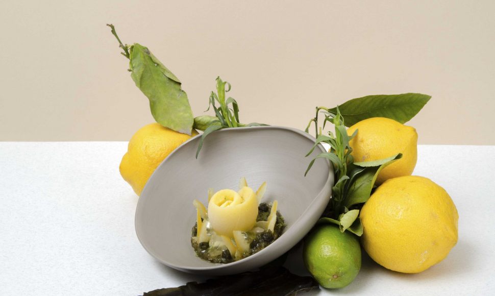 Un dessert où un sorbet puissant au kalamansi, petit agrume d'Asie du Sud-Est, repose sur un condiment sucré citron jaune et yuzu, ainsi qu'un pistou herbacé à l'estragon.