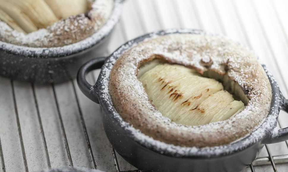 Un clafoutis aux poires préparé avec du lait de coco et de soja, avec une pâte à base de purée de graines de courge, légèrement vanillée.