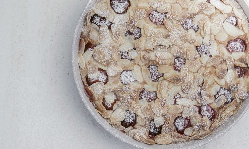 Le traditionnel clafoutis aux cerises, recouvert d'amandes grillées au four.