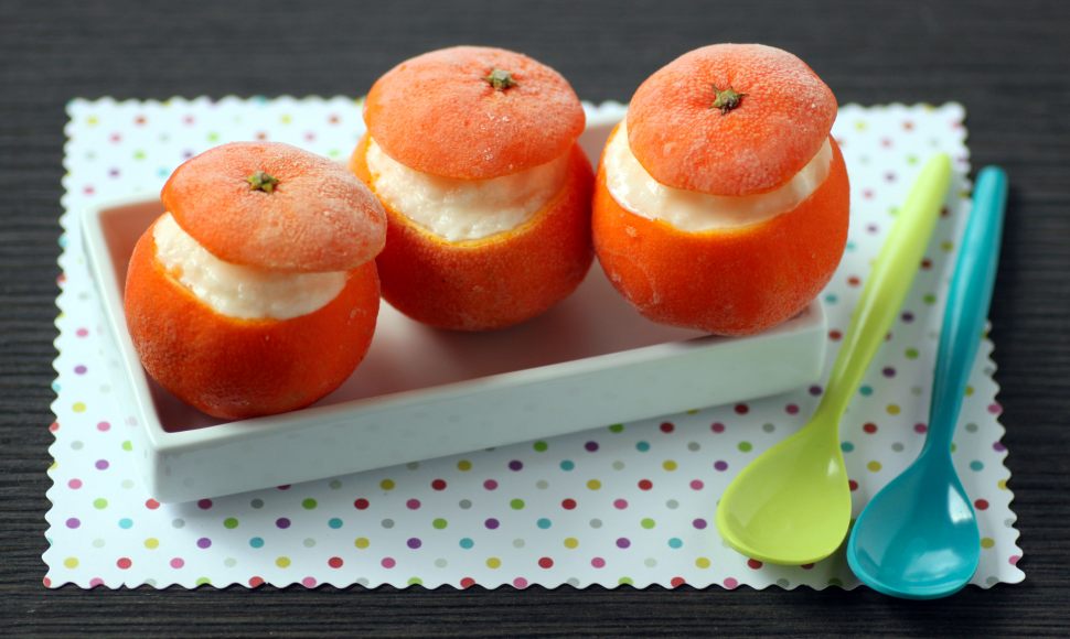 Sortez la glace 15 minutes avant de servir, puis garnissez les coques de clémentines évidées. C’est prêt !