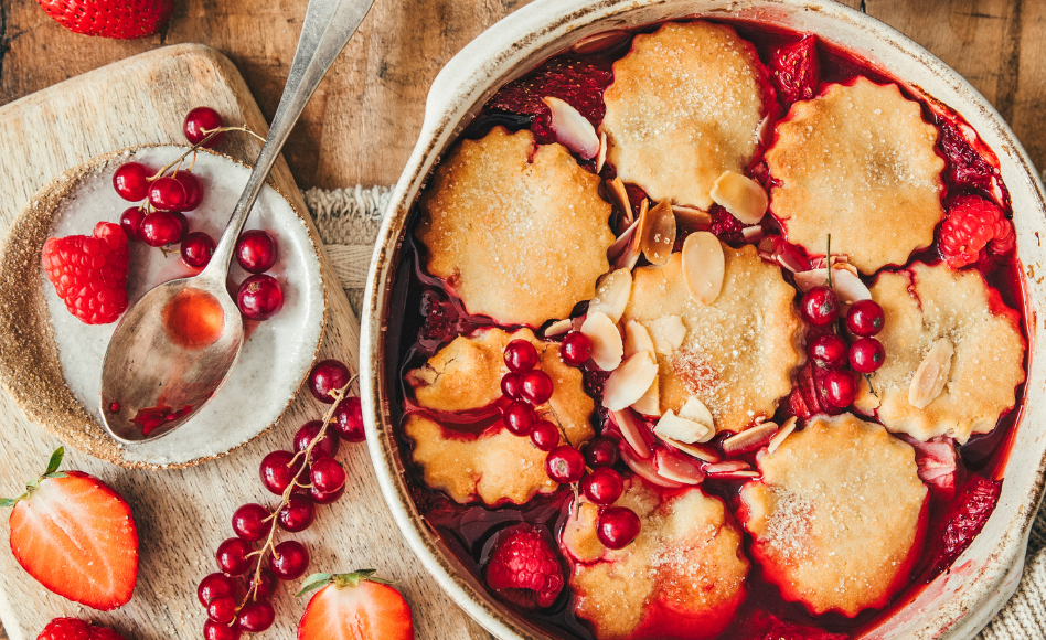 Le cobbler ? Une recette simplissime qui se réalise avec tous fruits de saison ! L'auteure culinaire du blog Fraise & Basilic a imaginé ce dessert avec les fruits de mai : fraises, cerises ou encore groseilles) pour la Coopérative Sherpa.