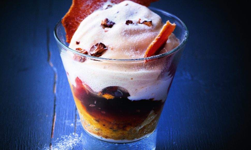 Préchauffez le four à 170 °C (th. 6). Mettez les blancs d’œufs et 15 g de sucre roux dans un saladier. Montez-les en neige bien mousseux mais surtout pas trop fermes. À l’aide d’une maryse, incorporez délicatement ces blancs en neige à la pâte à biscuit. À l’aide d’une poche à douille unie, garnissez de pâte à biscuit un cercle de 20 cm de diamètre et de 2 cm de haut, puis lissez à la spatule. Faites cuire pendant une quinzaine de minutes environ, selon votre four. Le biscuit doit être blond et rester souple pour être très fondant. Découpez 6 cercles de la taille du fond des verres.