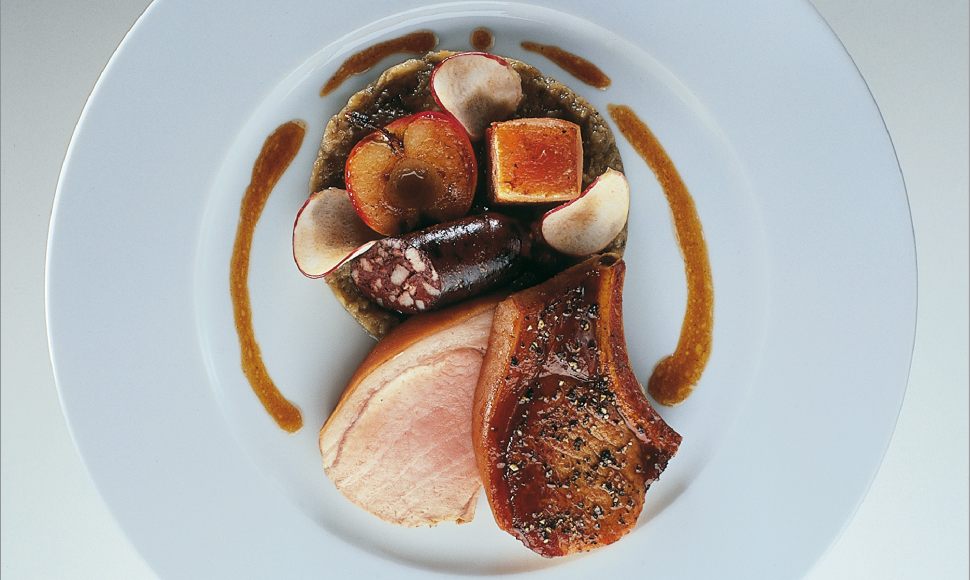 Cochon de lait rôti au feu de bois, lard paysan et sa couenne croustillante, boudin noir légèrement pimenté, hachis d’aubergines, pommes sauvages cuites et crues