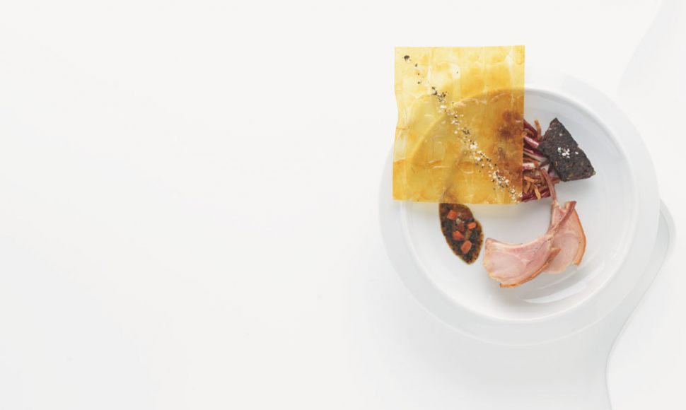 Cochon du mont Ventoux confit, sa couenne croustillante, boudin noir et jus tomato/truffe