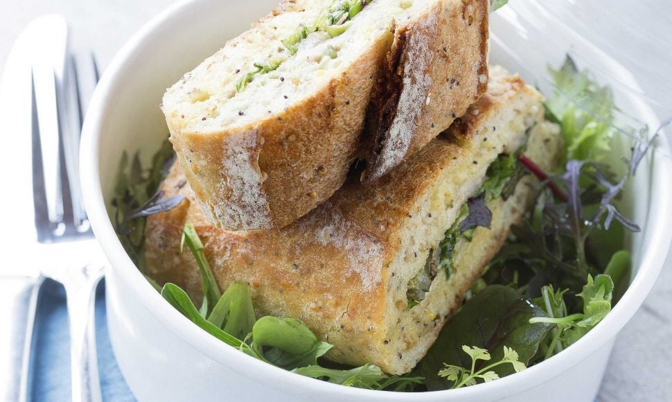 Un sandwich au rôti de porc, salade et fromage sec accompagné d'une mayonnaise maison.