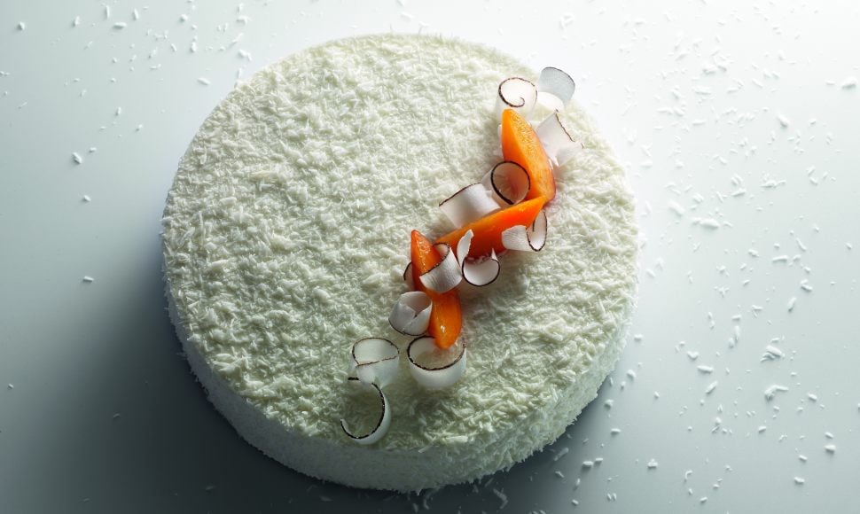 "La noix de coco est le seul ingrédient blanc pur qui se travaille en pâtisserie. Cet entremets, moelleux comme un oreiller, cache un cœur d’abricot acidulé qui apporte du peps et équilibre le côté « doudou » de la noix de coco, tout en réconfort."