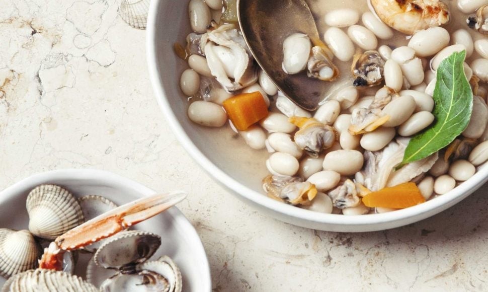 Un plat de haricots cocos aux coquillages et crustacés, légumes avec du vin blanc et cognac.