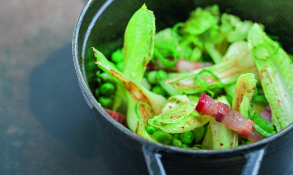 Écossez les fèves et les petits pois. Triez les fèves et mettez les plus petites de côté. Épluchez les petits oignons en gardant 5 cm de tige, puis lavez-les. Détachez les feuilles du cœur de romaine et lavez-les. Réservez celles de l’intérieur du cœur, les plus petites.