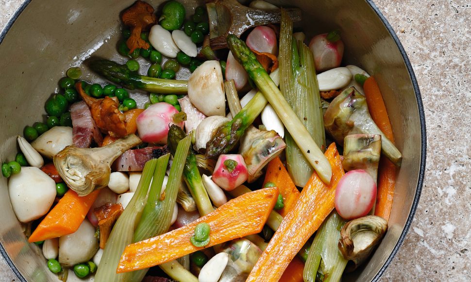Laver, éplucher, les carottes, les navets et les petits oignons en leur laissant 1 cm de fane. Laver les radis roses en leur laissant aussi 1 cm de fane. Laver les fenouils. Écussonner, laver les asperges vertes. Tailler les pointes sur 7 cm de longueur (réserver les tiges pour un potage). Tourner les artichauts, les tailler en 2 dans le sens de la longueur et les réserver dans de l’eau citronnée. Eliminer le pied des morilles, couper les plus grosses en 2, les laver soigneusement dans l’eau tiède et les sécher. Écosser les petits pois et les févettes.