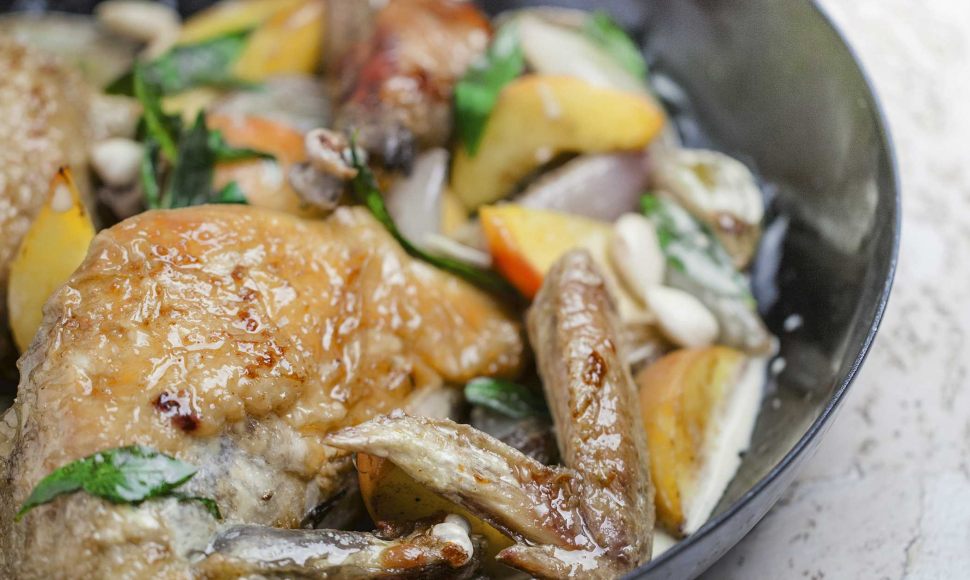 Un plat complet de pintade, aromatisée à la cuisson par des pêches caramélisées et des branches de verveine.