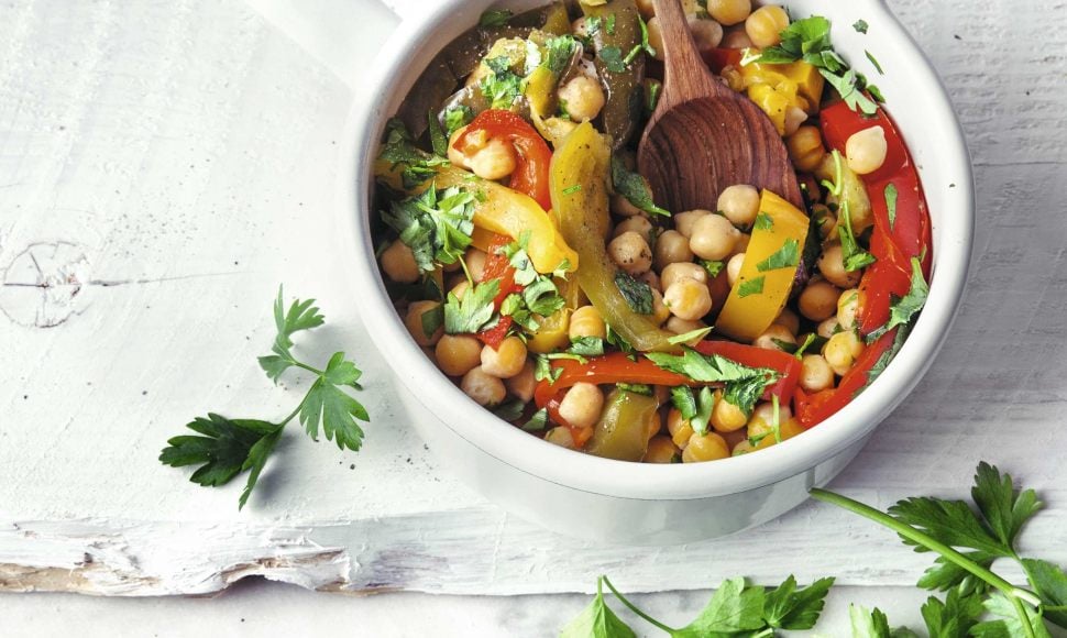 Une cocotte de pois chiches et poivrons cuits dans du vin blanc. Une recette saine et facile à réaliser !