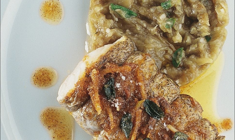 Le colinot (ou merlu) est un poisson à la chair tendre et peu marquée. Cette recette d'inspiration italienne est une spécialité de la région de Palerme où le poisson est généralement cuisiné en chapelure avec du citron pour une chair ferme et tendre à la fois. Alain Ducasse l'accommode d'un caviar d'aubergines gourmand, d'anchois et de romarin.
