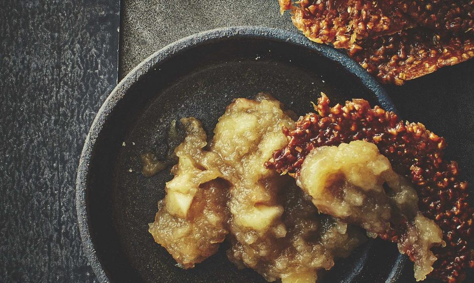 Un dessert original et fruité, des tuiles de sarrasin et d'amandes croustillantes que l'on déguste avec une onctueuse compote de pommes.