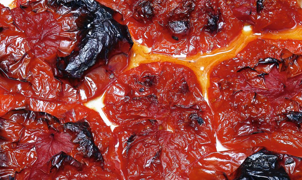 Sortez alors la plaque du four, retirez le papier sulfurisé, puis éliminez la peau des tomates. Filtrez le jus de tomate réservé et versez-le sur les tomates. Remettez la plaque au four et continuez la cuisson (sans les couvrir) pendant 1 heure environ, jusqu’à ce que les bords de la plaque commencent à caraméliser. Poursuivez cette cuisson pendant 5 minutes en grattant les sucs deux ou trois fois et en remettant la plaque au four chaque fois. Transvasez la concassée dans une boîte en plastique et réservez-la au frais ou congelez-la. Si vous l’utilisez tout de suite, ajoutez-lui 2 cuillerées à soupe d’huile d’olive pour l’assaisonner et la faire briller.