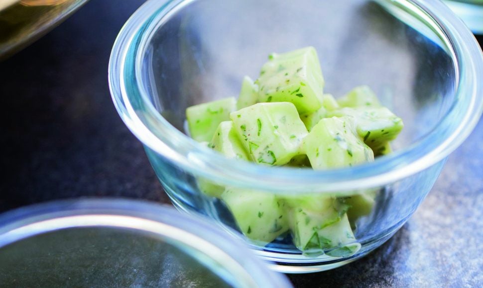 Épluchez les concombres à l’aide d’un économe et coupez-les en deux dans le sens de la longueur. Enlevez les graines à l’aide d’une cuillère à pomme parisienne, puis taillez les concombres en dés de 1 cm de côté. Réservez. Lavez le persil, récupérez toutes les feuilles et hachez-les finement.
