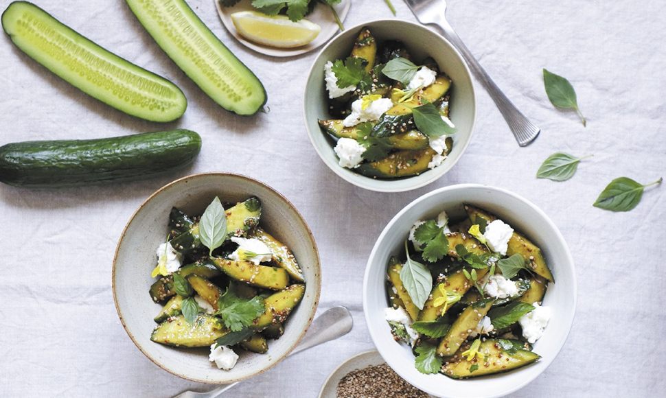 Concombres au sésame, coriandre, menthe et chèvre frais