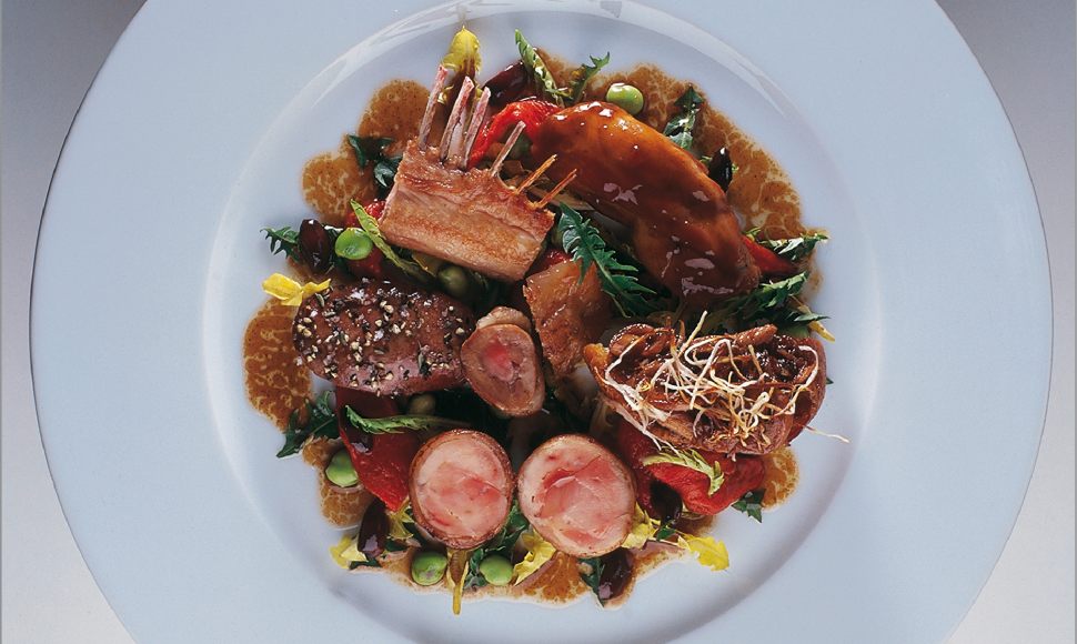 Confit de lapin, foie tiède aux févettes, olives niçoises et thym frais, des salades sauvages
