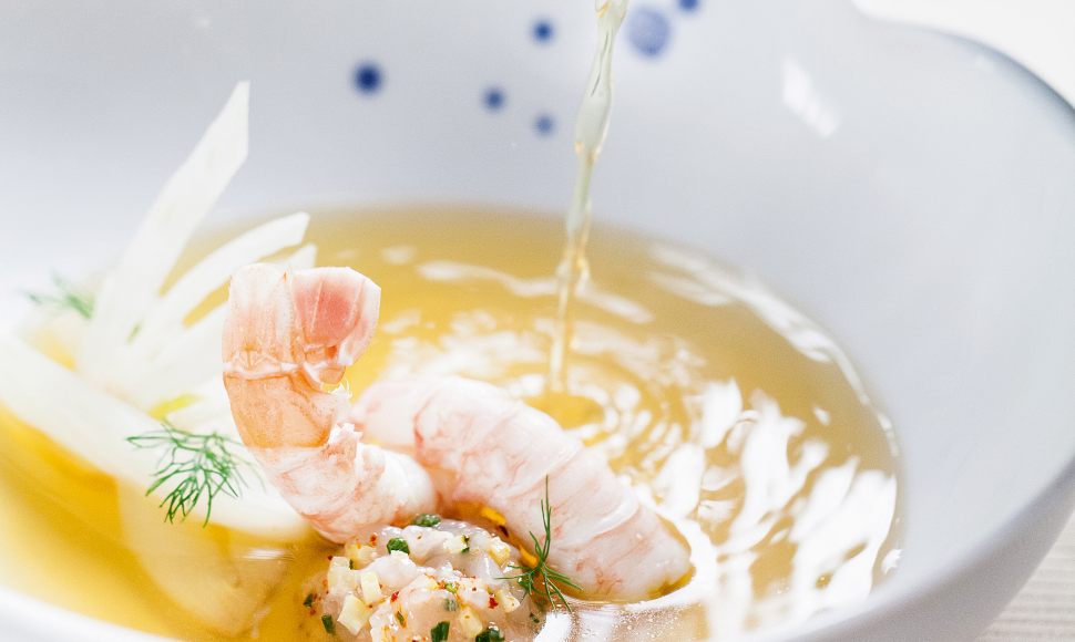Consommé de langoustine, d’autres crues et marinées au citron vert