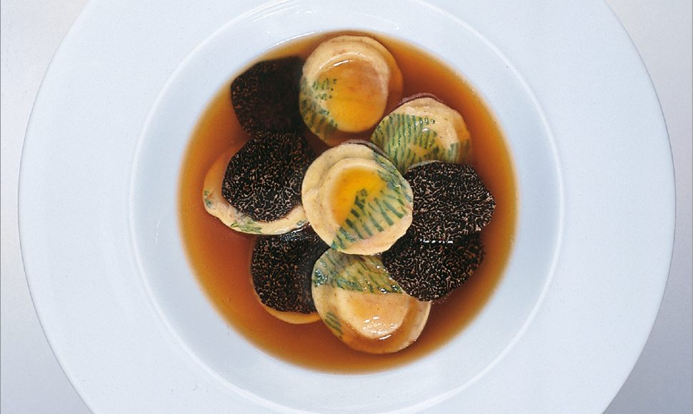 Consommé double aux petits ravioli imprimés à la moelle et râpée de truffe noire