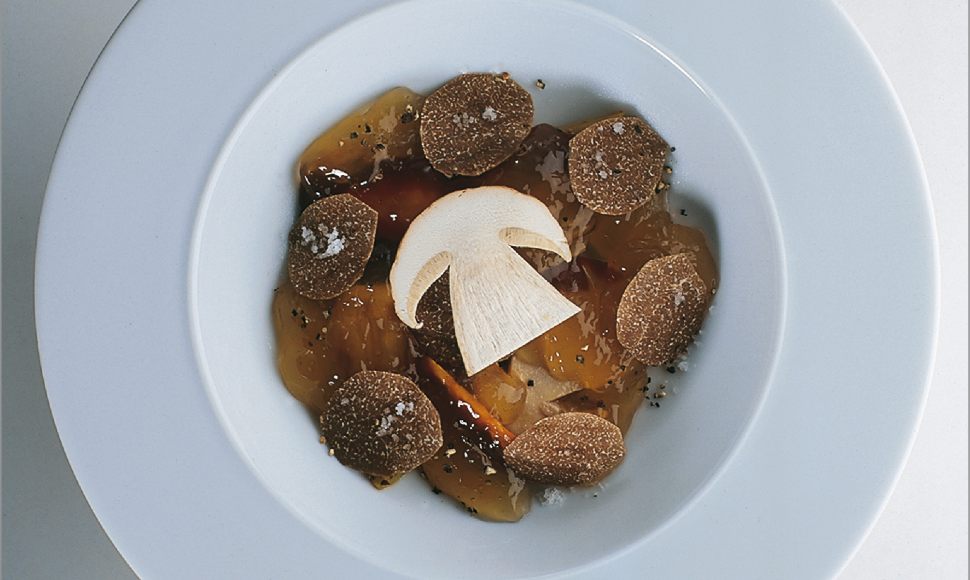 Consommé goûteux de jarret de veau à peine pris en gelée, tuber aestivum
