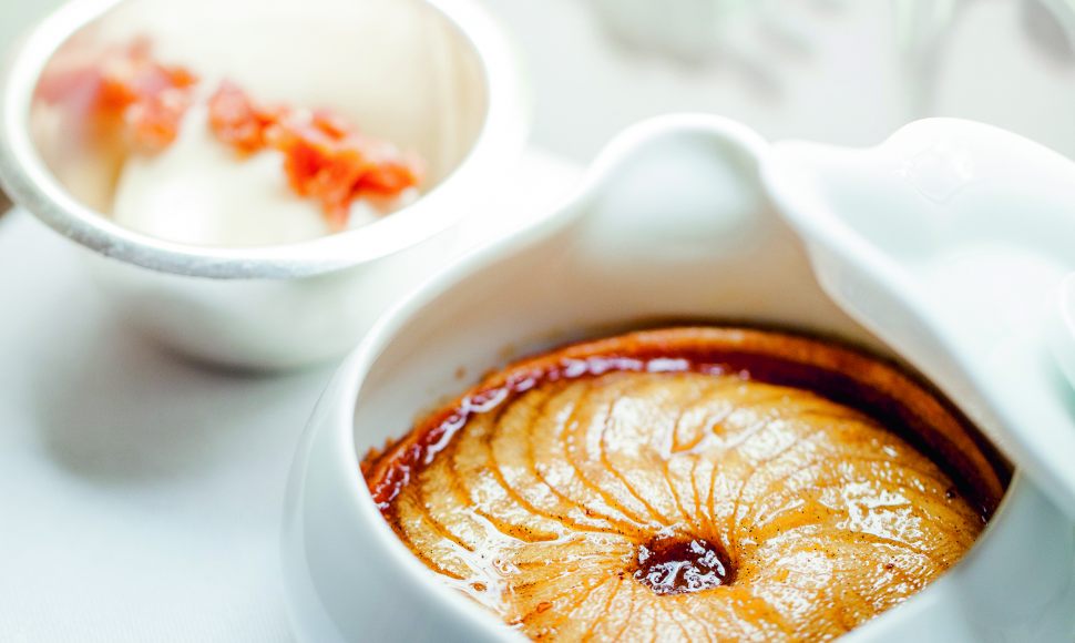 Baissez la température du four à 165 °C (th. 6). Épluchez les pommes et coupez-les en petits quartiers. Dans une casserole, faites chauffer le sucre et l’eau jusqu’à obtenir un caramel, puis coulez-le dans un moule à manqué. Déposez les quartiers de pommes sur le caramel, recouvrez d’une feuille d’aluminium et enfournez pour 40 min en prenant soin de retourner les quartiers de pommes dans le caramel toutes les 10 min. Réservez.