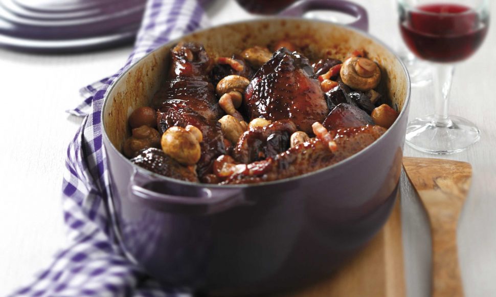 Suivez la recette de ce plat français emblématique, des morceaux de volailles ayant mariné dans du vin de Bourgogne rouge, des légumes, des champignons de Paris et du lard de poitrine demi-sel. Un plat riche en goût à déguster durant vos repas de famille.