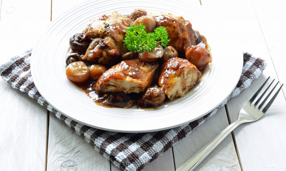Grand classique de la cuisine française, et plus particulièrement de la gastronomie bourguignonne, le coq au vin est un plat mijoté convivial et savoureux. Il est conseillé de le cuisiner avec un vin corsé et aromatique (vin de la Vallée du Rhône, par exemple). Ce plat s’accompagne généralement de pommes de terre, en purée ou cuites à l’eau. Les tagliatelles se marient également très bien avec le coq au vin. Plus inattendu, vous pouvez servir votre plat avec une poêlée de topinambours.