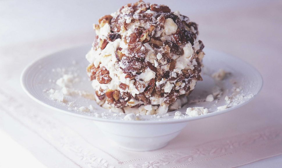 Coque de marrons glacés et noix à la liqueur Drambuie accompagnée d'une chantilly et d'une sauce à la vanille.